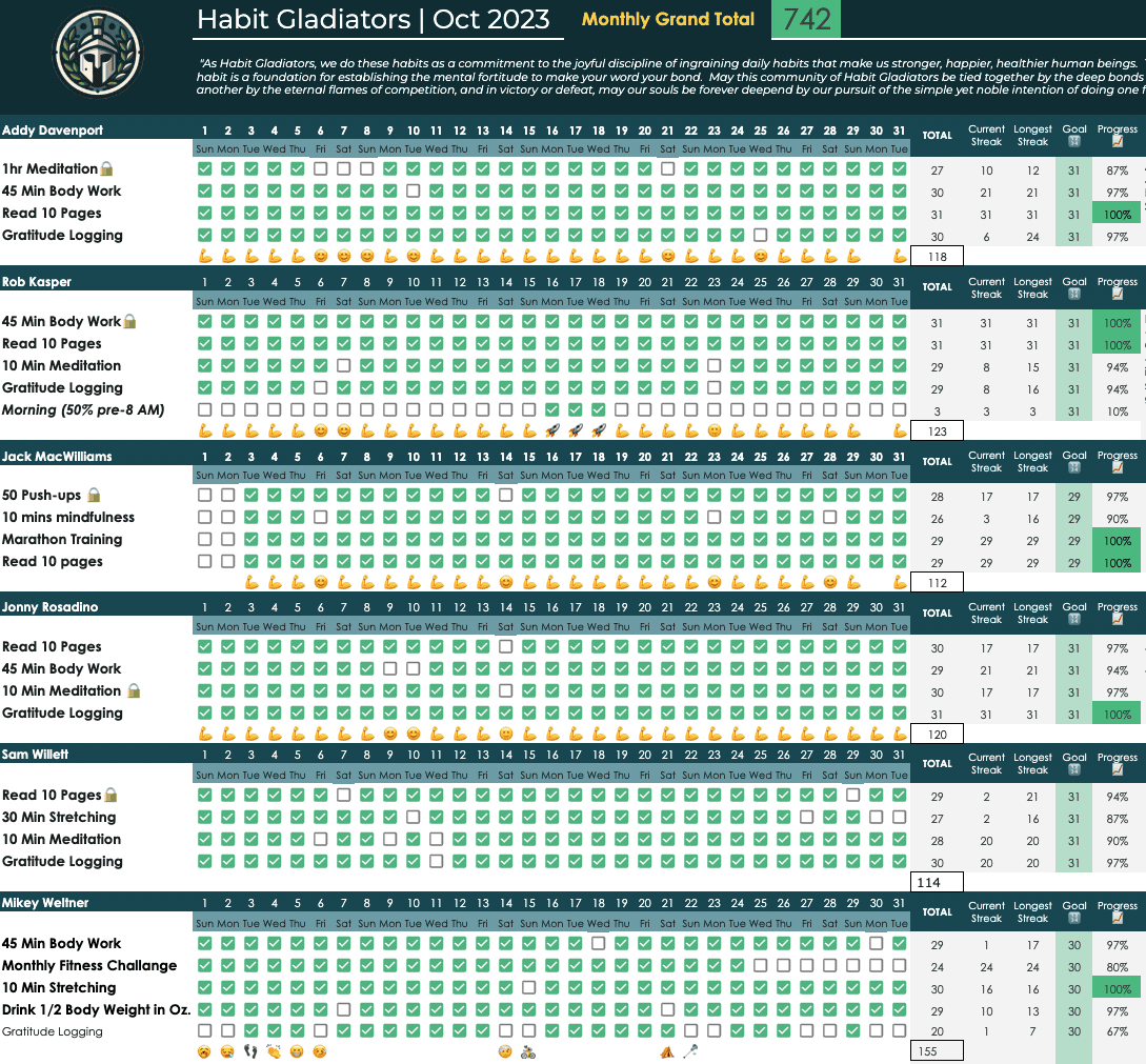 🏆 You can only manage what you can measure. By tracking our habits together we can see our relative progress.