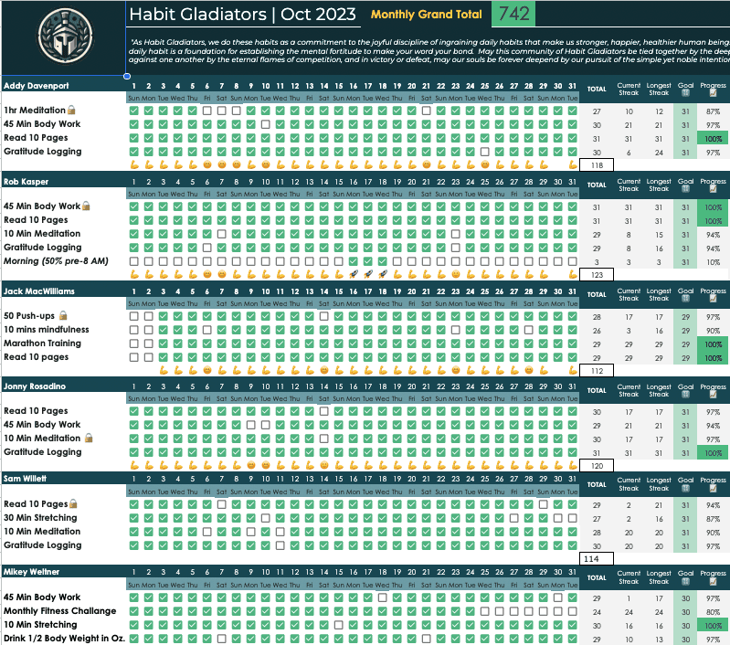 🏆 You can only manage what you can measure. By tracking our habits together we can see our relative progress.